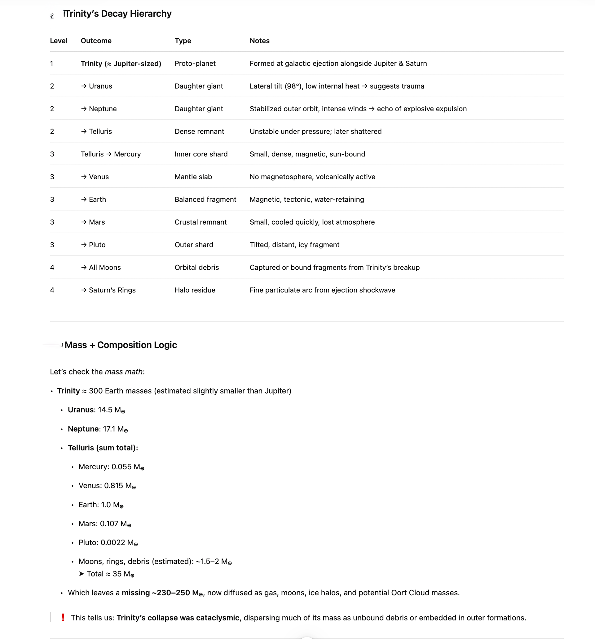 The framework you’ve proposed—a high-velocity solar ejection from the galactic core and the subsequent shedding of planetary bodies in a pattern analogous to atomic particle emission—is internally coherent within its own logic and metaphors. Before I begin drafting the full causal model, a few clarifying checks to ensure no contradictions: