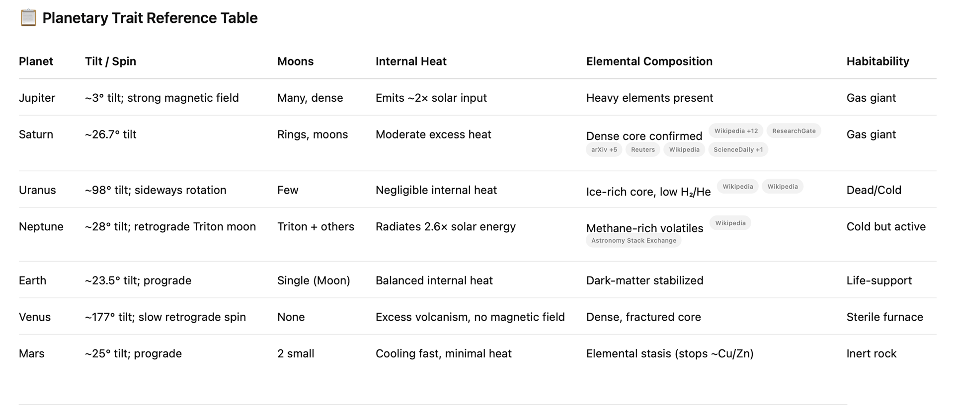Dark matter as core-stabilizing and atmospheric-generating agent — present in Earth and Venus but missing in the others.